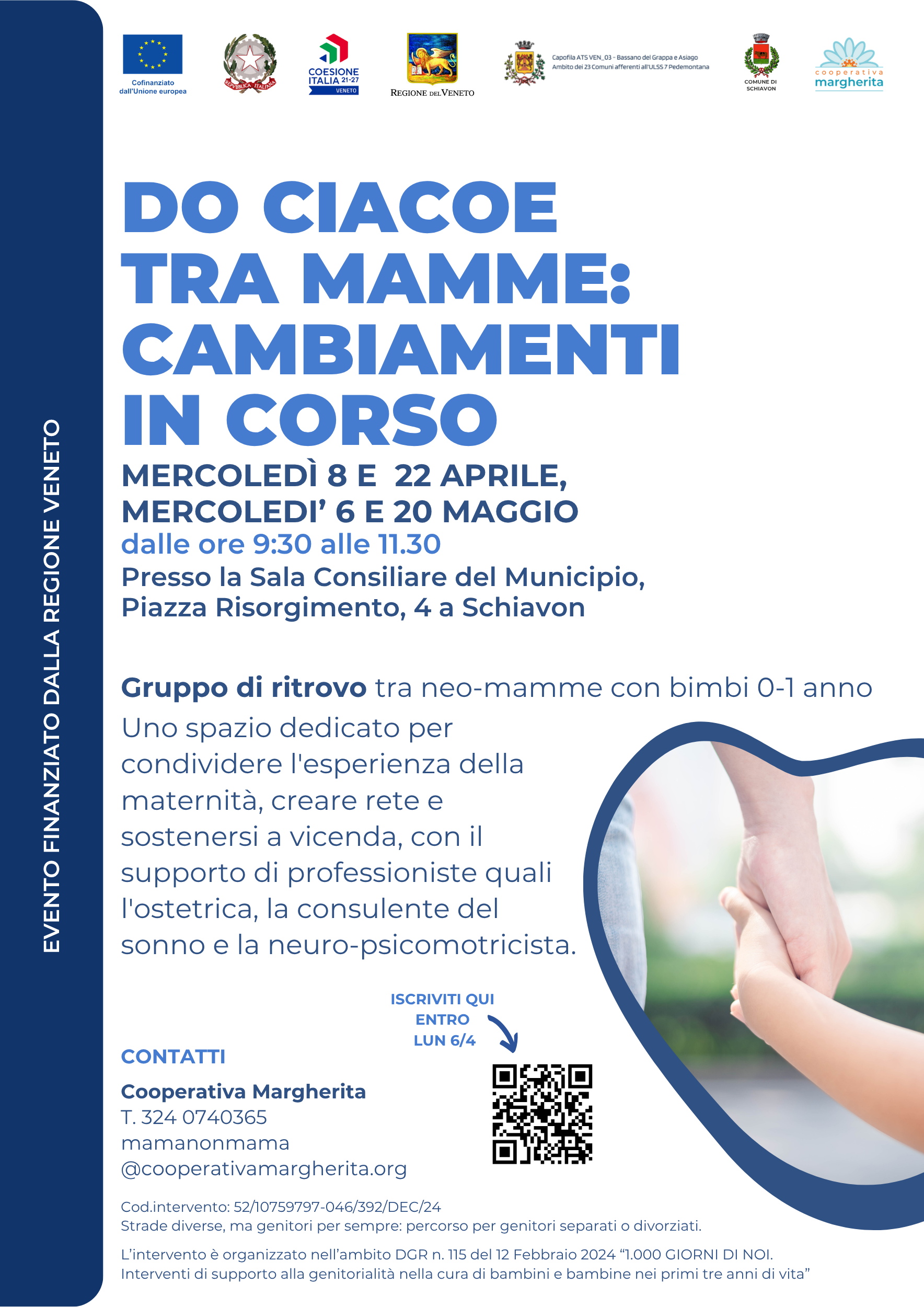 Il Comune di Schiavon, in collaborazione con la Cooperativa Margherita e nell'ambito del progetto regionale "1.000 Giorni di Noi", invita tutte le neo-mamme con bambini di età compresa tra 0 e 1 anno a un ciclo di incontri dedicati al confronto e al benessere.